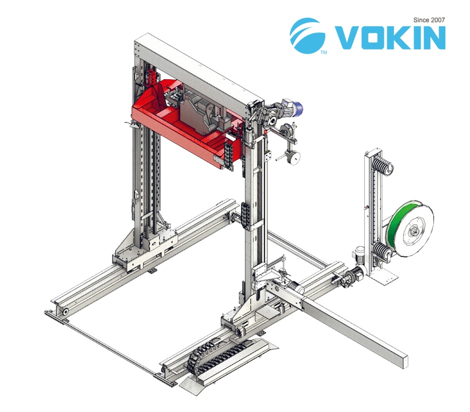 VR4型號應用在全自動包裝線上,機頭在頂部,可以停留在客戶的任意高度的產(chǎn)品上,同時穿箭機構(gòu)穿過托盤角內(nèi),完成捆扎。如果客戶需要“#”十字交叉的捆包形式,VR4-INDEX是配置移動導軌和電機,讓機器移動到托盤需要的打帶位置,加上產(chǎn)品旋轉(zhuǎn)90°后,即完成“#”捆扎,使托盤物料更加的穩(wěn)固。