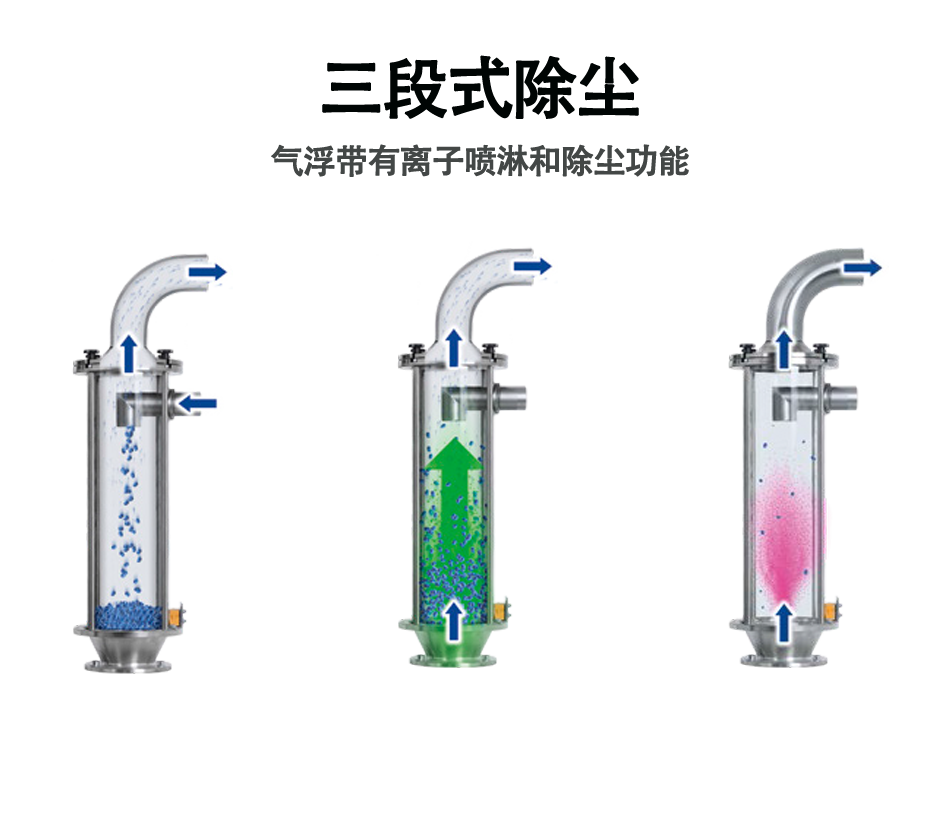 用可自由調(diào)節(jié)旋轉(zhuǎn)的電離空氣漂 浮的空氣進行粉塵分離。