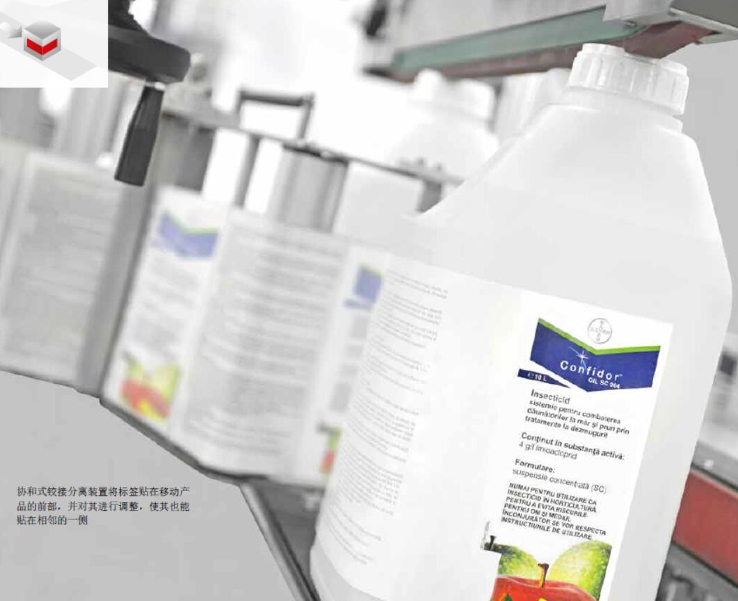 協和式鉸接分離裝置將標簽貼在移動產品的前部,并對其進行調整,使其也能貼在相鄰的一側